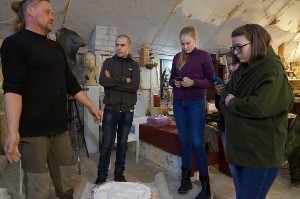 Пока в мастерской шли работы по воссозданию памятного знака, скульптора посетила группа школьников - участников проекта из Оленино и Холмеца. Для них Андрей Валентинович провёл мастер-класс "Памятник, как форма увековечения подвига". Ребята узнали о целях, этапах создания памятников, некоторых секретах работы скульптора. Самые смелые попробовали поработать с глиной, освоили технику изготовления декора с помощью тиражных форм.