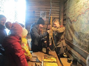 Миссия разрезать красную ленточку была возложена на внука погибшего на Холмецкой земле красноармейца Александра Алексеевича Мазина - Александра Анатольевича Мазина. В музее гостей ждало ещё одно событие. Аудиозапись рассказа Сергея Виноградова (участника команды Проекта) "Мы были солдатами..." в исполнении профессионального артиста звучала над диорамой. Это внесло особый настрой в происходящее. И уже в другом свете воспринимались слова выступающей агитбригады. Затем взяла слово делегация из Москвы, из школы, где учился А.И. Левин, совершивший подвиг самопожертвования. Ребята передали плакат, посвященный герою, к нам в музей. После торжественной части первая группа школьников отправилась на тактическую игру "Февраль 1942 г.", вторая - осталась на мастер-класс "Стрелковое оружие РККА". Затем группы поменялись. Часть гостей осталась осматривать экспозиции, часть пошла болеть за участников боя. Бойцы в полной мере почувствовали сложность выполнения задачи боя за Холмец. После боя всех ждала солдатская каша и чай с бутербродами и пирожками.